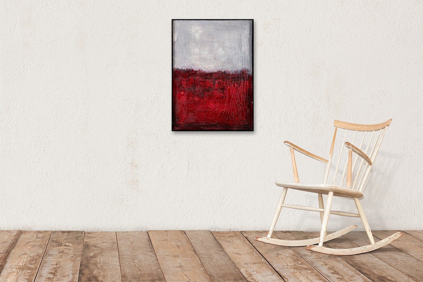 Ein Bild mit viel Struktur, in rot und weiß/grau gehalten. Das Bild wurde von der Künstlerin mit einer selbst hergestellten Umrahmung aus Holz versehen, welcher nicht professionell hergestellt ist. Er dient nur der Veranschaulichung, wie das Bild in einem Rahmen wirken würde. Die Umrahmung gibt es dazu, sie kann vom Käufer entfernt und durch einen Rahmen ersetzt werden.