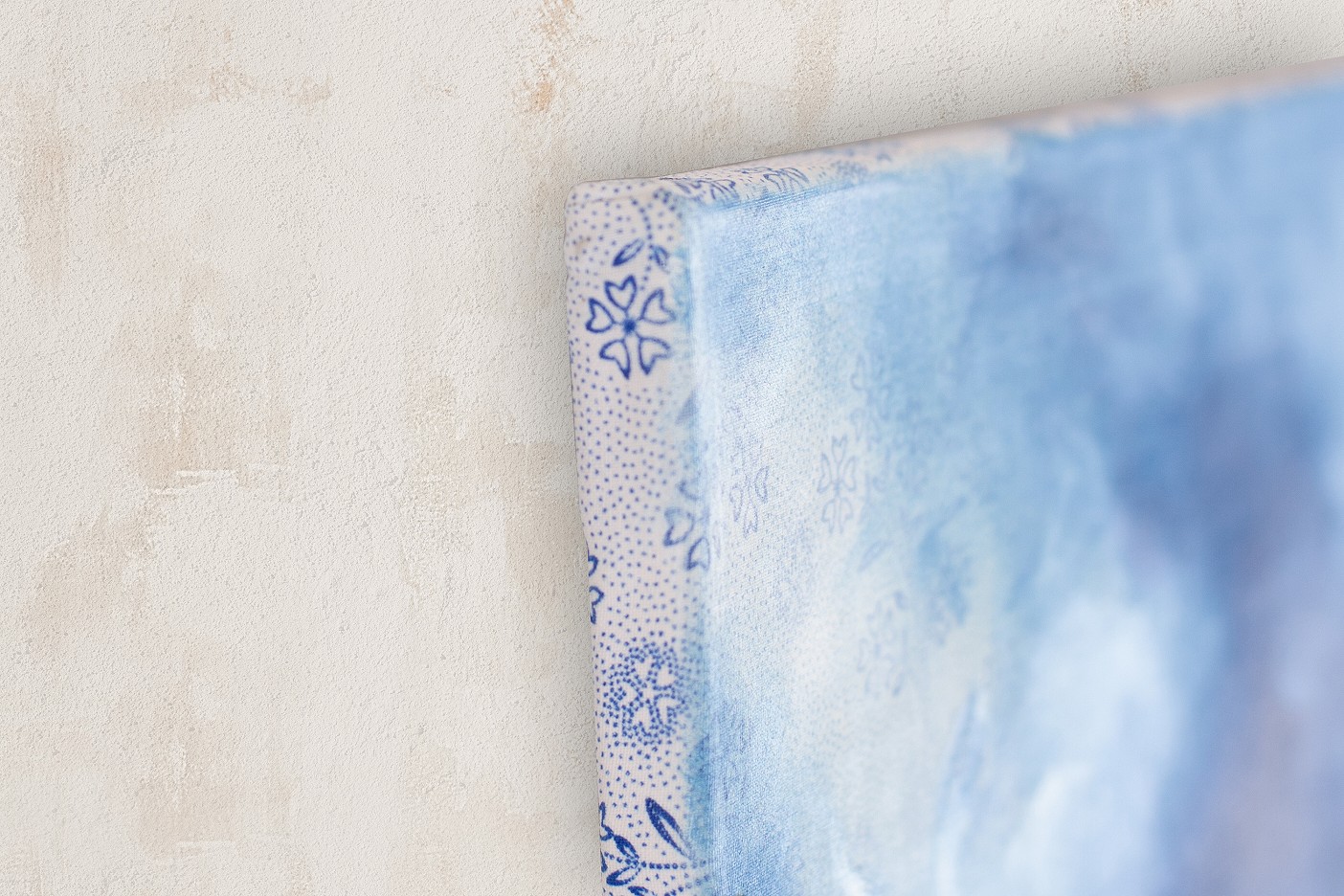 Dieses Bild gehört zu einer Serie von 4 Himmelbildern. Alle im gleichen Format und ebenfalls wie die meisten der Bilder von Antje Krohn auf alten Stoff gemalt. Dieser ist zusätzlich auf Leinwand montiert. in den Himmelbildern hat die Künstlerin verschiedene Himmelimpressionen auf die Leinwand gearbeitet.
