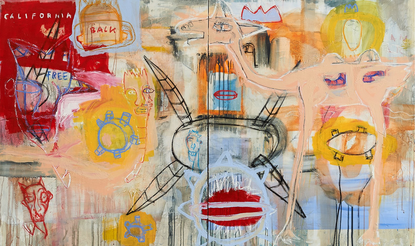 Zweiteiliges Großformat, verbunden durch Scharniere. Spachtel- und Wischtechnik, Acryl und Ölkreide auf Leinwand. Ein klarer Farbauftrag auf verwaschenem Grund löst das Bild auf. Das Abstrakt-Figurative trägt ebenfalls dazu bei.