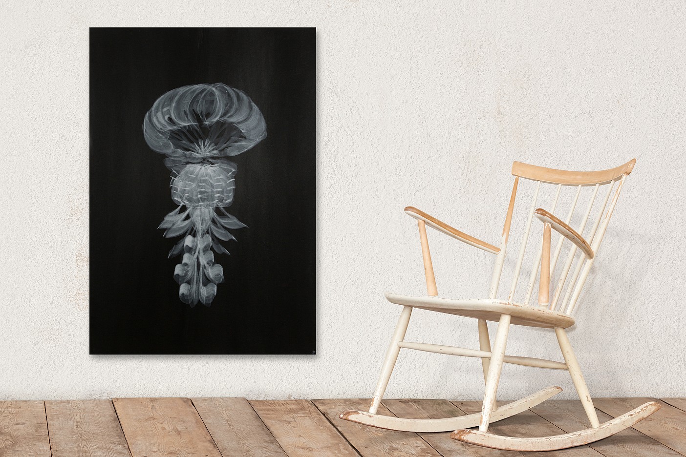 Zeichnung mit weißer Acrylfarbe auf schwarzem Karton, symmetrisch angelegte Formung, Zeichnung