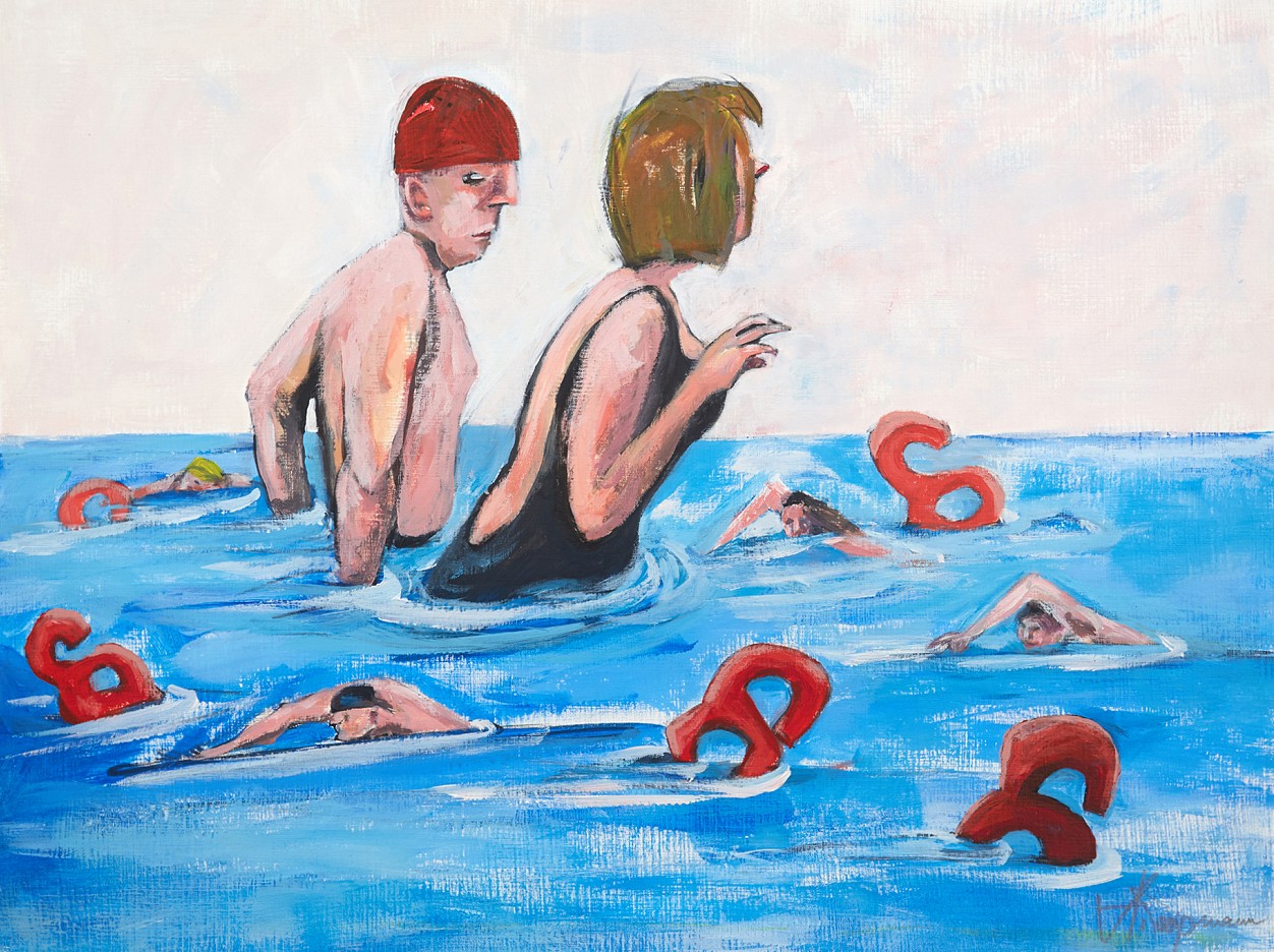 Zwei Riesen, ein Mann mit Badekappe und eine Frau, waten durch ein Gewässer gegen den Strom. Kleine Menschen und rote Paragraphen treiben und schwimmen ihnen entgegen.