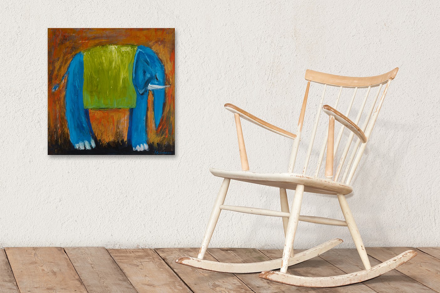 Schlafender, blauer Elefant mit grüner Decke richtet den Körper nach rechts aus, für den Überblick